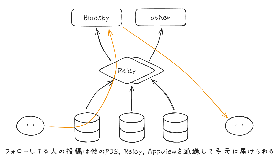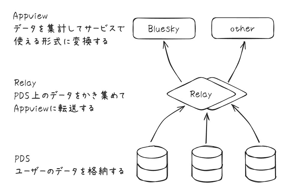 PDSにデータを書き込むと、Relayが新着データを受け取り、AppViewへと転送します。AppViewがいわゆる「サービス」であり、Blueskyと呼ばれる部分もここに当たります。