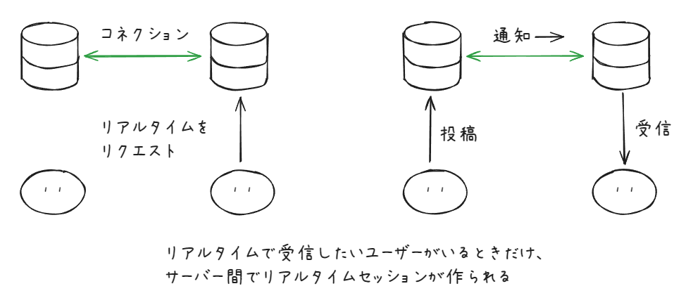 Concrntは基本的にPull型であるため、そのままではリアルタイム性が失われてしまいます。ほかのサーバーで投稿が発生したときに、それをすぐに検知することができません。 そのためConcrntでは、ユーザーがリアルタイムを要求した場合には、サーバー間にその情報を配信するためのwebsocketのコネクションが確率されます。