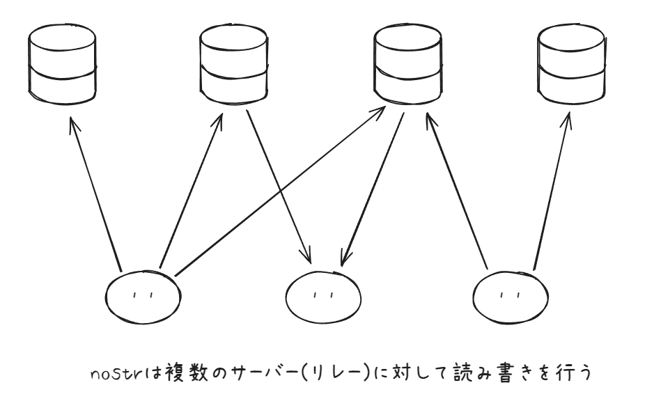 nostrはConcrntと同じくプルかつwebsocketによるリアルタイム性を持つプロトコルです。 サーバーはリレーと呼ばれていて、ユーザーは複数のリレーに接続し、自分の投稿を同時に投稿したり、また複数のリレーからデータを取得し合成します。