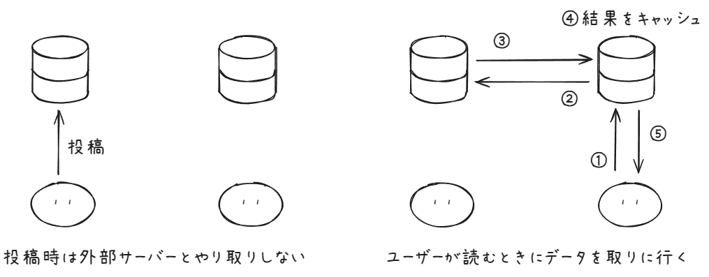 この方法は、リクエストからユーザーにレスポンスを返すまでの時間が長くなるという欠点がありますが、Concrntでは高度なキャッシュ戦略により、この問題を緩和しています(あくまでも遅くなるのは事実です)。 ただプル型にすることで、自身のサーバーがダウンしていもほかのサーバーに迷惑をかけることがないという利点があります。ユーザーがサービスを利用してない間、なんのリクエストも発生しないため、効率的です。