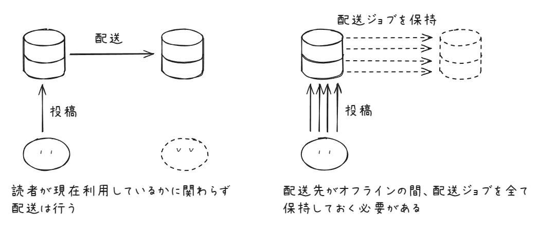 これはシンプルな仕組みである一方、受信サーバーのユーザーがもうそのサービスを利用していない場合でも、投稿は送り続ける必要があるという問題があります。 また、送り先サーバーがダウンしている場合、送信元サーバーはそのサーバーが復旧するまで投稿を保留し、サーバーが復帰した際に再送信を行う必要がありますが、 これは復活直後のサーバーが高負荷に陥る原因にもなりますし、また送信元サーバーとしても配送ジョブを保持し続けるのはコストがかかります。