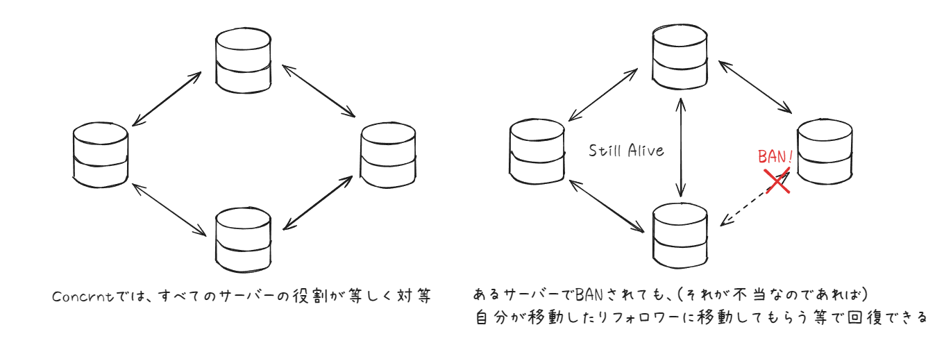 ConcrntはBlueskyとは構成が異なり、全てのサーバーが対等な関係を持っています。